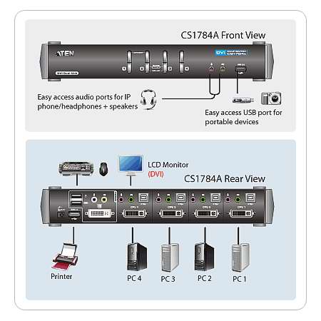 CS1782A USB DVI Dual Link KVMP多電腦切換器的推出,為KVM產品功能創造了革命性的新方向。此款產品整合了2埠KVM多電腦切換器與2埠USB Hub,同時支援DVI介面的螢幕與音訊功能。此外,CS1782A提供的進階功能,包括支援120Hz 3D顯示、遊戲鍵盤,並可透過滑鼠切換選擇連接埠,提供用戶彈性化、方便的使用環境。