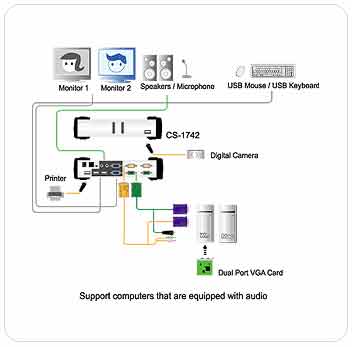 CS1742整合視訊雙輸出與USB KVMP?切換器功能,讓支援雙螢幕顯示的電腦,可以透過一組USB鍵盤及滑鼠,與兩組VGA/ SVGA/Multisync 顯示器搭配控制。此外,CS1742提供2組USB連接埠功能,可讓每台伺服器電腦主機分享使用接續到這HUB的任何一個USB週邊裝置。