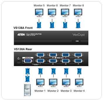 VS138A視訊分享器能將所接收的視訊訊號,透過複製成8組450MHz的訊號輸出,並可透過影像增益調節鈕來增強訊號,其傳輸距離可達65公尺。